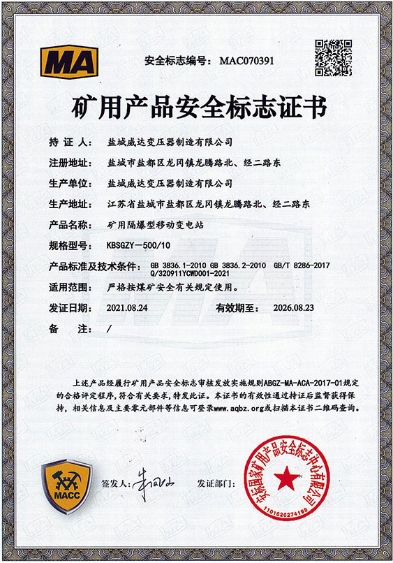 鹽城威達變壓器制造有限公司主要生產產品有KBSGZY系列礦用隔爆型移動變電站、KBSG系列礦用隔爆型干式變壓器、礦用一般型電力變壓器、干式變壓器、組合式變壓器、箱式變電站、低壓成套設備及特種變壓器。KBSG、KBSGZY系列礦用防爆變壓器廣泛用于有甲烷混合氣體和煤塵,且有爆炸危險的礦井中,作為礦井下泵站、運輸機、采掘機等用電設備的配電裝置。
